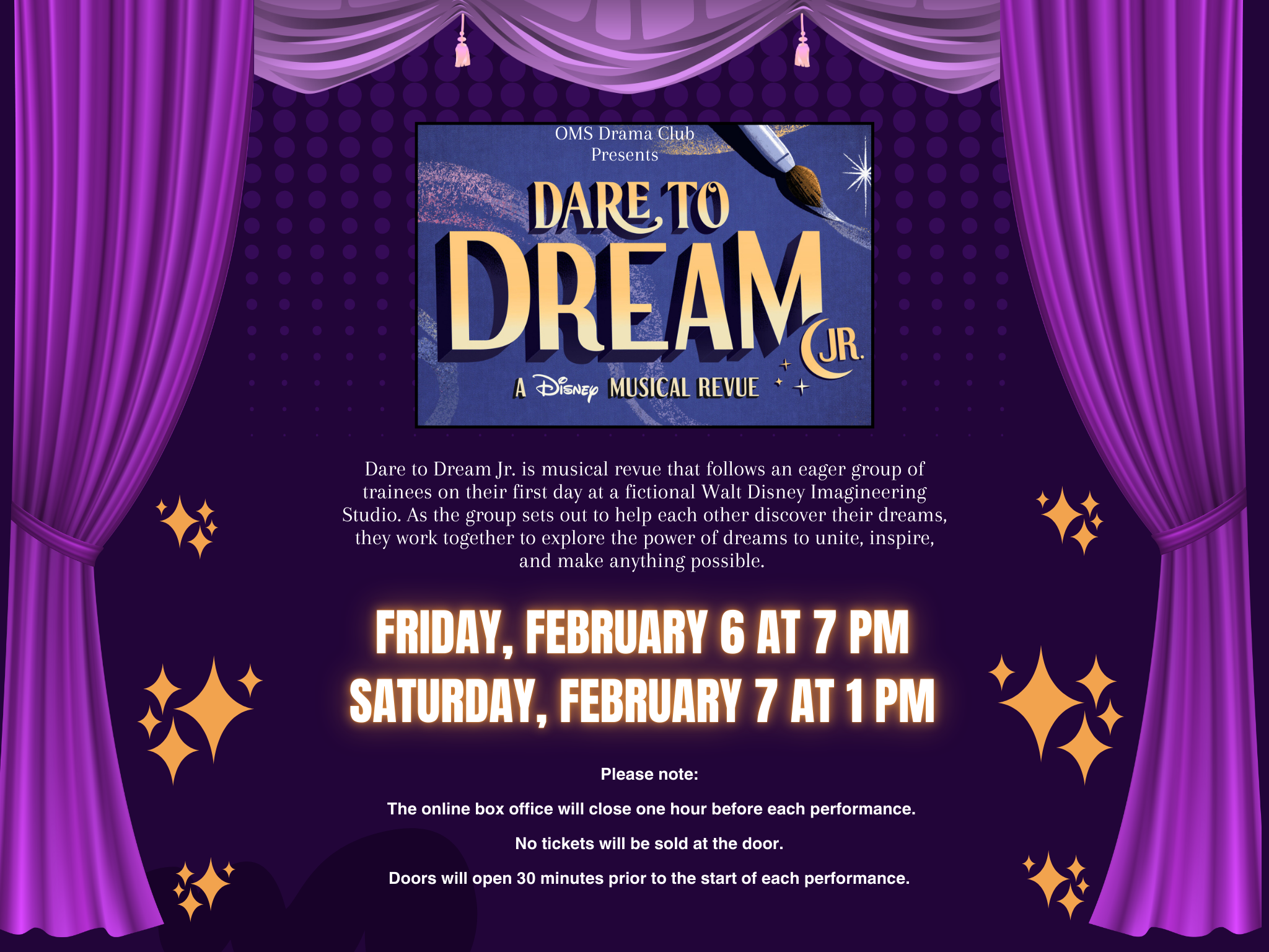 I also invite you to come see the OMS Drama Club's performance of "Dare to Dream Jr." on February 6 at 7 PM and February 7 at 1 PM at Oldfield Middle School. Drawing from a century of beloved Disney films, "Dare to Dream Jr." features a mix of contemporary songs, timeless classics, and brand-new medleys that are sure to surprise and delight Disney lovers of all ages. No tickets will be sold at the door, please click here to purchase.