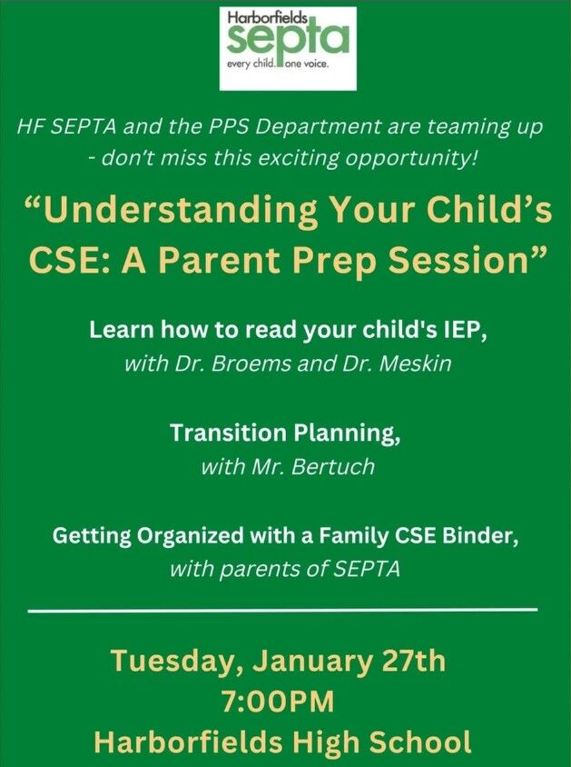 Please join SEPTA and the Harborfields PPS Department for an important workshop, "Understanding Your Child's CSE: A Parent Prep Session." The workshop will feature Harborfields staff who will walk through the reading of your child's IEP and transition planning. SEPTA parents will also discuss the importance of creating and organizing a family CSE binder. Don't miss this special workshop on Tuesday, January 27th at Harborfields High School.