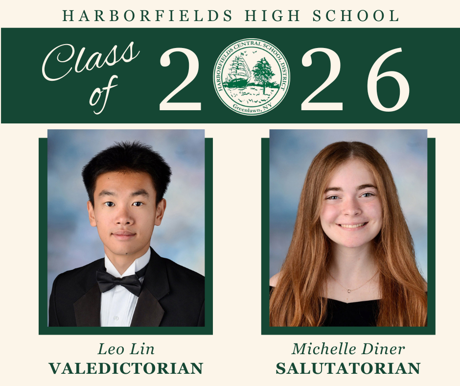 Last week, the Valedictorian and Salutatorian for the Harborfields High School Class of 2026 were announced. Please join me in congratulating Leo Lin, Valedictorian, and Michelle Diner, Salutatorian, on their well-deserved honors! These remarkable students exemplify academic excellence, integrity, and a positive impact on their school community. We can't wait to see what they will accomplish next!
