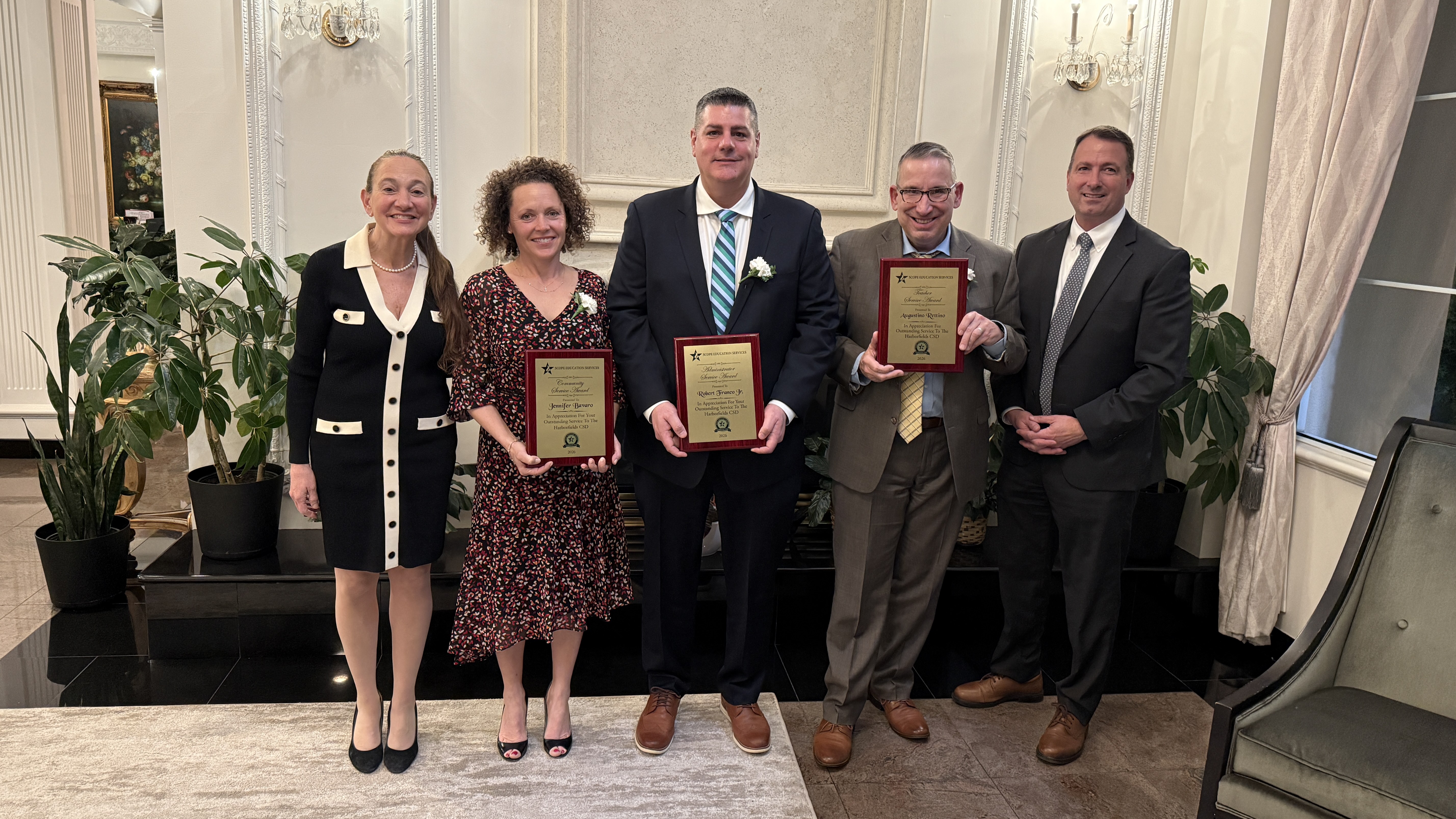 I am pleased to share that three outstanding individuals were recognized for their service to our students, staff, and community at the SCOPE Service Award Ceremony last Monday. Please join me in congratulating our Outstanding Administrator Service Award winner, Mr. Rob Franco; our Outstanding Teacher Service Award winner, Mr. Augie Rettino; and our Outstanding Community Service Award Winner, Ms. Jen Bavaro. Joining me in support of our award winners was Board of Education Vice President, Dr. Eve Meltzer-Krief. Thank you for all you do, and congratulations!
